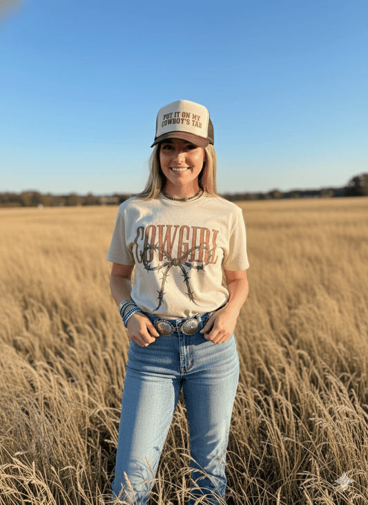 Regular price $16.00 USDRegular priceUnit price / perSale price $16.00 USDCowgirl Barbed Wire Bow Graphic Tee