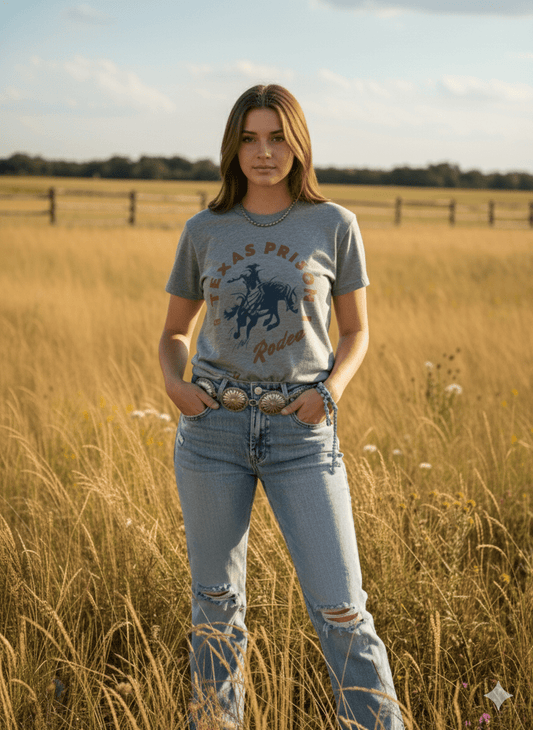 Regular price $17.00 USDRegular priceUnit price / perSale price $17.00 USDTexas Prison Rodeo Cowboy Raw Cut V-neck Graphic Tee