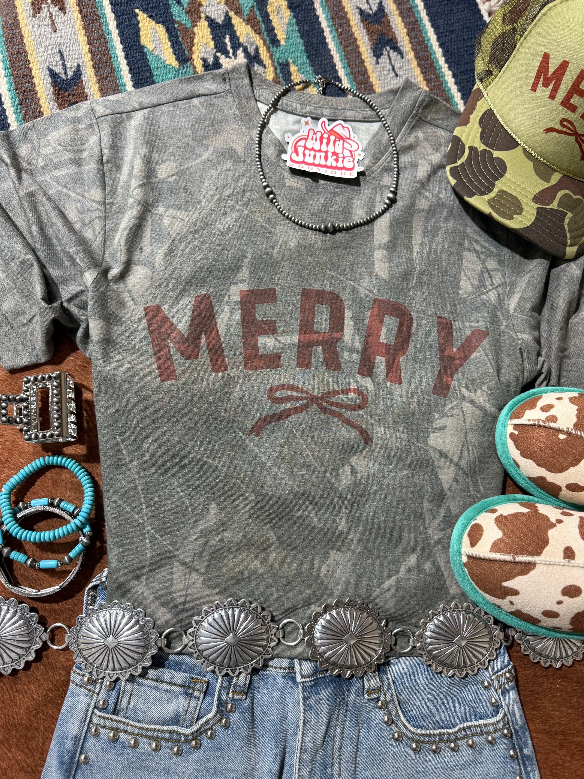 This comfortable tee features a cool, subtle tree camouflage pattern overlaid with the bold red text "MERRY" and a cute, simple bow graphic. It’s the ideal choice for those who want to show their holiday spirit with an edge—perfect for Christmas gatherings, running errands, or just staying cozy while blending in (or standing out!).