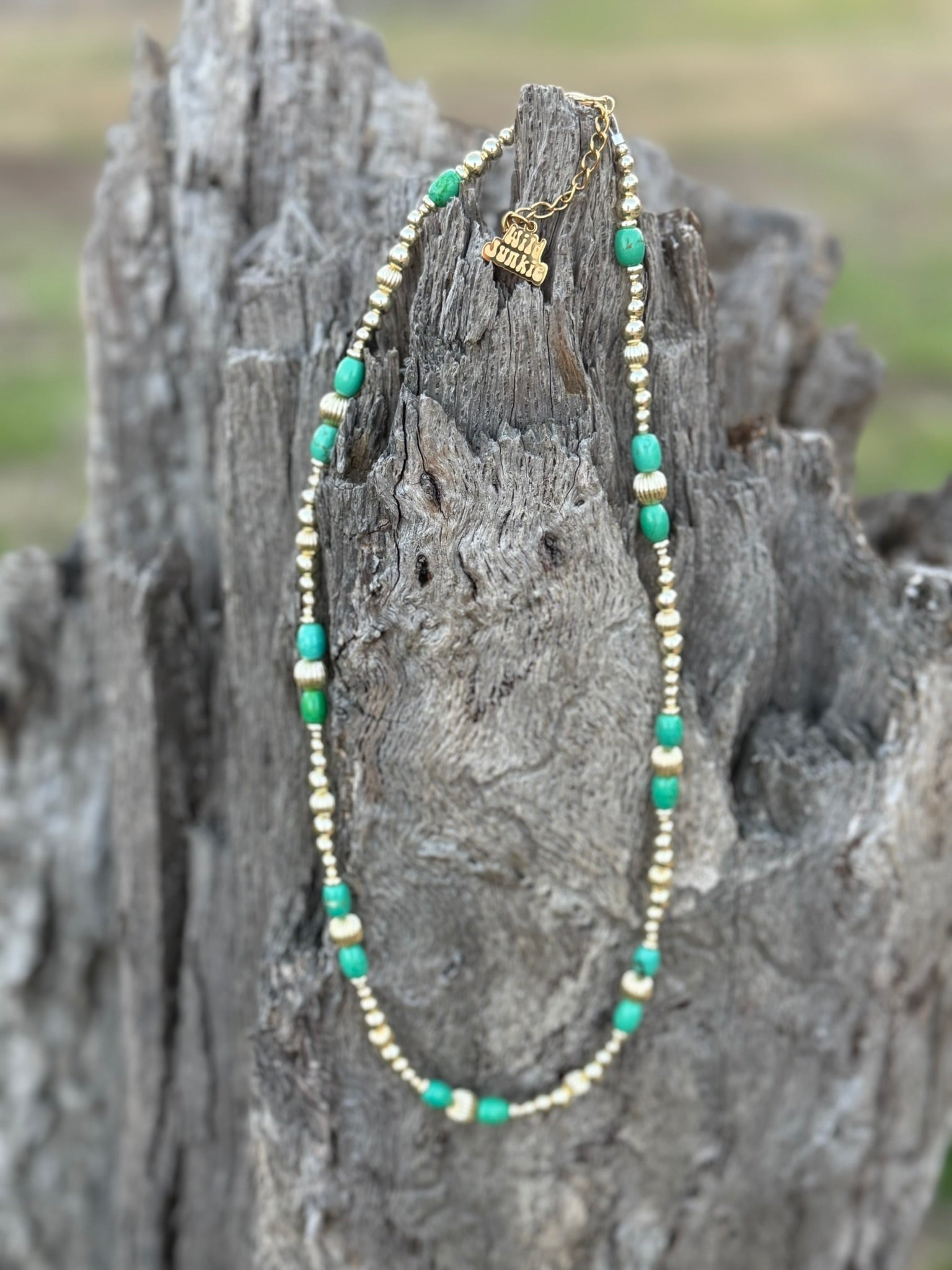 Elevate your wrist game with a splash of Southwestern soul! This Turquoise and Gold Beaded Necklace perfectly blends earthy charm with a touch of high-shine glam. Featuring vibrant, marbled turquoise stones nestled between polished gold beads and unique textures, it’s the ultimate wear-everywhere accessory. This piece brings those effortless bohemian-chic vibes to any outfit. It's radiant and ready for your next adventure!